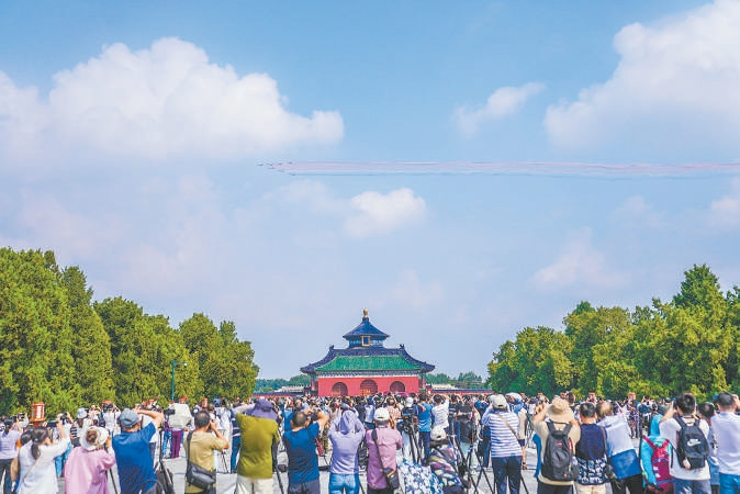 9月3日,市民在天坛公园见证空中梯队经过。本报记者武亦彬摄
